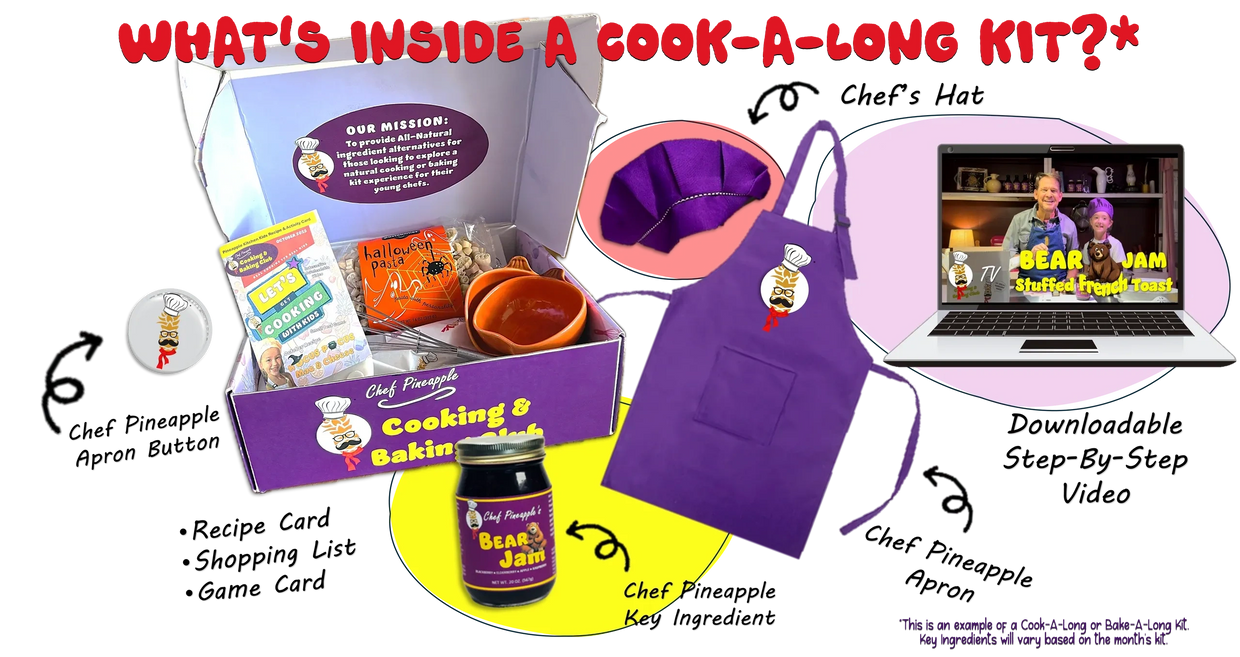 In addition to your monthly Cooking & Baking Kit, you have the option to purchase extra items such as aprons, chef hats, buttons, and Chef Pineapple ingredients through our online merchandise store. Simply click on the Chef Pineapple Shop tab to browse our curated selection and enhance your culinary experience.